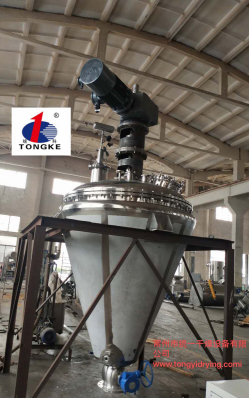 三、工作原理    加熱錐體設有加熱夾套,熱源為熱水、導熱油或低壓蒸汽,從而能使錐體內壁保持一定的加熱溫度。工作時(shí),在真空泵的作用下,機內保持一定的真空條件。傳動(dòng)系統帶動(dòng)螺旋帶狀攪拌裝置旋轉,物料在攪拌的作用下在設備內部不斷地翻動(dòng),并與錐體內壁充分接觸,實(shí)現熱量傳遞,從而使物料內部水分不斷蒸發(fā),水蒸汽由真空泵引出,經(jīng)冷凝器收集。干燥完成后,打開(kāi)下部的出料閥出料。